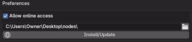 *the install/update button fetches the updated nodes and adds them to the asset browser. if the asset path already exists it will ignore the chosen directory and update instead. make sure enable online access is enabled.